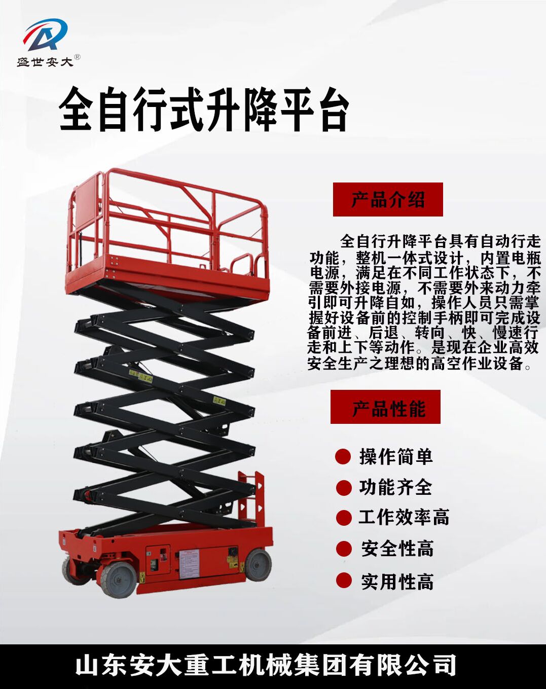 升降機廠家-山東安大重工機械集團有限公司,是生產、銷售、維修為一體的廠家,安大重工集團提供各種形式的移動液壓升降平臺,產品遠銷國內外,一直遙遙領先。移動剪叉式升降機的用途廣泛。是專業的高空作業機械設備,對于該機械設備產品的安全性能有著較高的要求,所以選購移動剪叉式升降機時,一定要選擇有保障的、資歷深厚的廠家。 ...